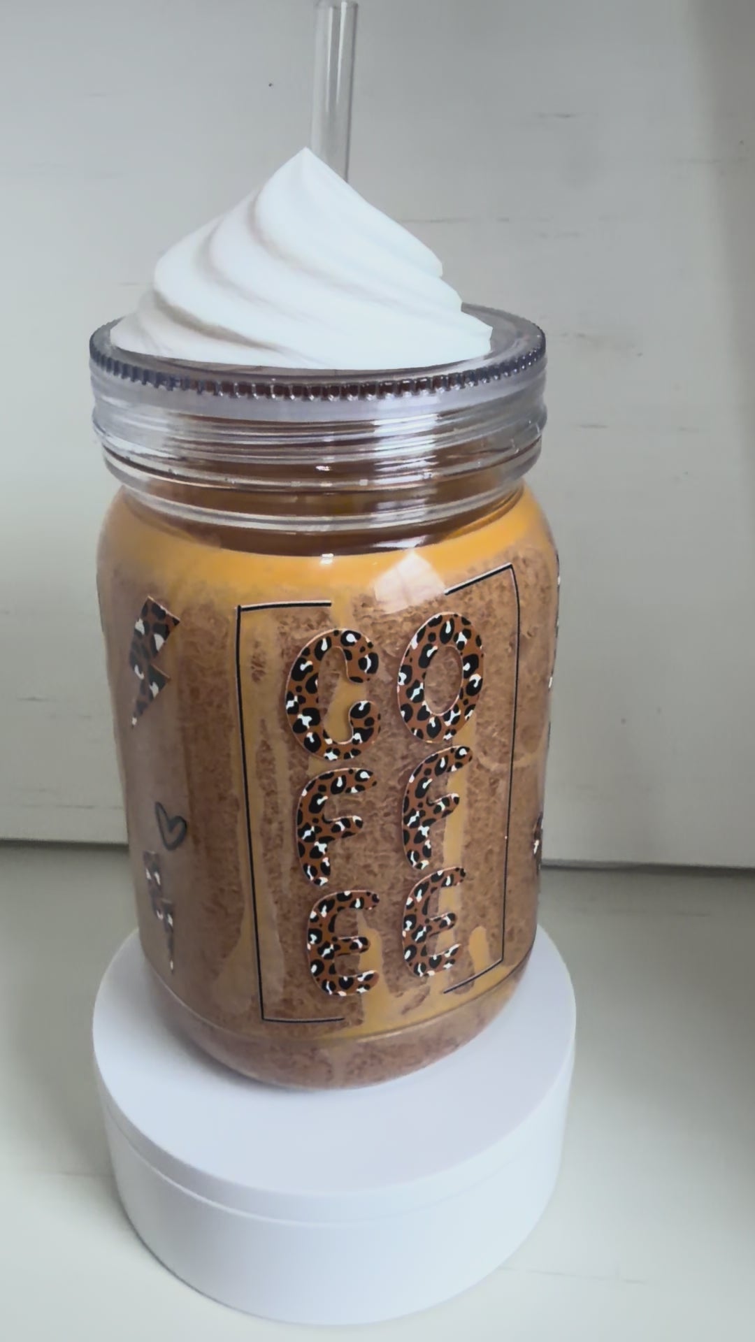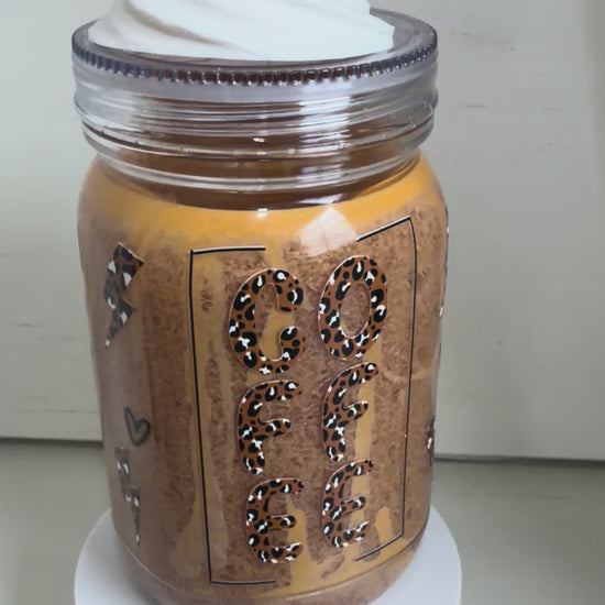 This is a super cute mason jar style tumbler is made to look like your favorite caramel frappe. This unique gift is perfect for all coffee lovers!